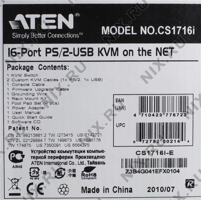 | Комплект поставки | 2 кабеля KVM (1 x PS/2; 1 x USB), кабель RS232, заземляющий провод, CD-диск |