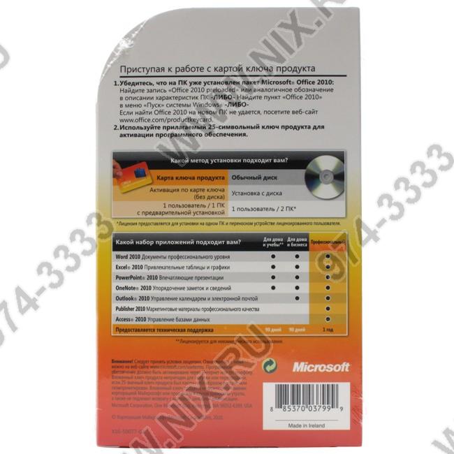 | Карта ключа продукта; предназначена для приобретения с новым ПК, на котором уже установлен пакет Microsoft Office 2010 (Word, Excel, PowerPoint, OneNote, Outlook, Publisher, Access). |