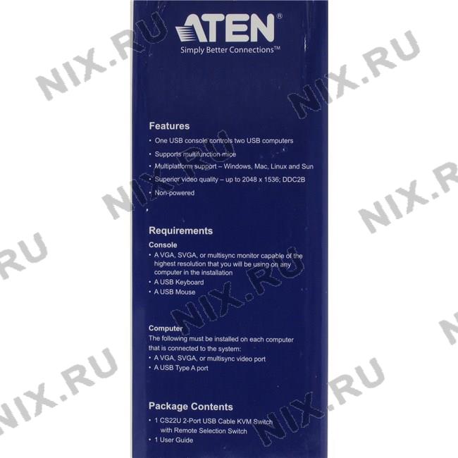 ATEN CS22U(-A) 2-port USB Cable KVM Switch (клавиатура USB+мышьUSB+VGA15pin, проводной ПДУ, кабели несъемные)