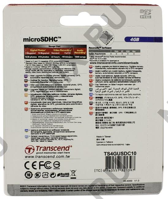Transcend TS4GUSDC10  microSDHC 4Gb Class10