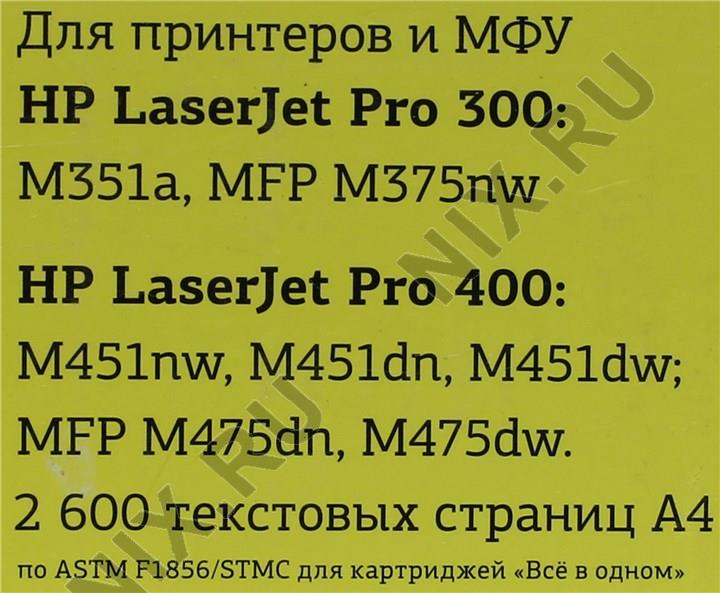 | Совместимость | HP Color LaserJet Pro 300 M351a, 300 MFP M375nw, 400 M451dn, 400 M451dw, 400 M451nw, 400 MFP M475dn, 400 MFP M475dw |