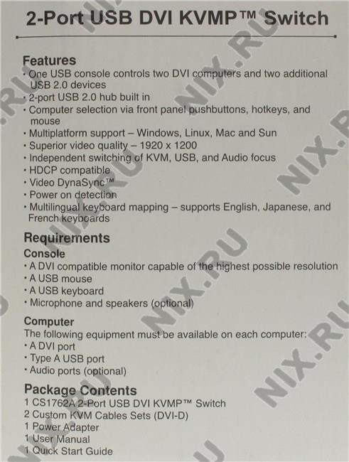 ATEN CS1762A USB2.0 DVI KVMP Switch (клавиатура USB+мышь USB+DVI+Audio+Mic)(+2 кабеля)