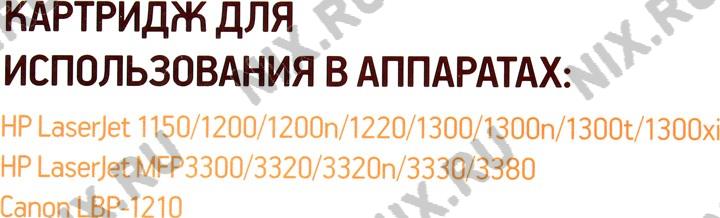 | Совместимость | HP LaserJet 1150, 1200, 1200n, 1220, 1300, 1300n, 1300t, 1300xi, HP LaserJet MFP 3300, 3320, 3380, Canon Laser Shot LBP1210 |