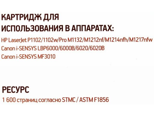 СовместимостьCanon i-SENSYS LBP6000, LBP6000B, LBP6020, LBP6020B, MF3010, HP LaserJet Pro M1132, M1212nf, M1214nfh, M1217nfw, HP LaserJet P1102, P1102w