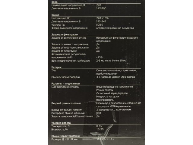 | ЖК-дисплей | ЕстьВходное/выходное напряжение, режим работы ИБП, остаточный заряд батареи ИБП, мощность нагрузки, неисправность ИБП |