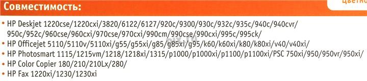 СовместимостьCanon FAX 1220xi, 1230, 1230xi, HP Color Copier 180, 210, 210Lx, 280, HP Deskjet 1220cse, 1220cxi, 3820, 6122, 6127, 920c, 9300, 930c, 932c, 935c, 940c, 940cvr, 950c, 952c, 960cse, 960cxi, 970cse, 970cxi, 990cm, 990cse, 990cxi, 995c, 995ck, HP Officejet 5110, 5110v, 5110xi, g55, g55xi, g85, g85xi, g95, k60, k60xi, k80, k80xi, v40, v40xi, HP PSC 750xi, 950, 950vr, 950xi, HP Photosmart 1115, 1215vm, 1218, 1218xi, 1315, p1000, p1000xi, p1100, p1100xi