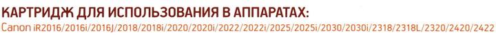 СовместимостьCanon iR2016, iR2016i, iR2016J, iR2018, iR2018i, iR2020, iR2020i, iR2022, iR2022i, iR2025, iR2025i, iR2030, iR2030i, iR2318, iR2318L, iR2320, iR2420, iR2422