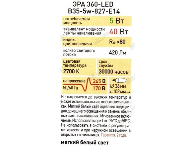 ЭРА 360-LED B35-5w-827-E14 (E14, 420 люмен, 2700К, 5Вт, 170-265В)