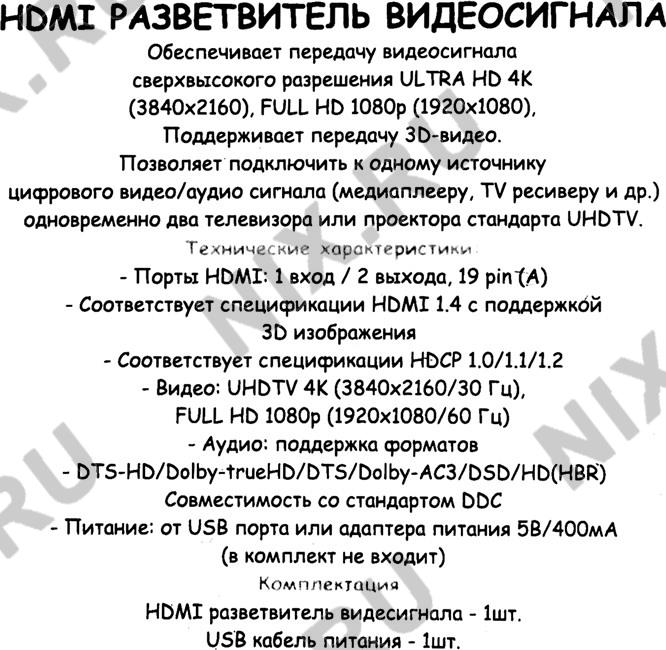 Идеальное решение для тех, кому необходимо подсоединить один источник цифрового видеосигнала высокого разрешения к 2 дисплеям одновременно. Поддерживается передача звука, 4K Ultra HD и 3D