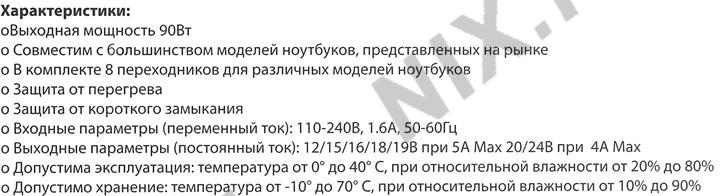 | Диаметр коннектора БП (внешний x внутренний) | 7.4 x 5.0 мм; 5.5 x 2.5 мм; 5.5 x 2.1 мм; 5.5 x 1.7 мм; 4.8 x 1.7 мм; 4.5 x 3.0 мм; 3.0 x 1.0 мм; 2.5 x 0.7 мм |