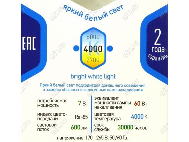 ЭРА (smd) A60-7w-840-E27 (E27, 600 люмен, 4000К, 7Вт, 170-265В)
