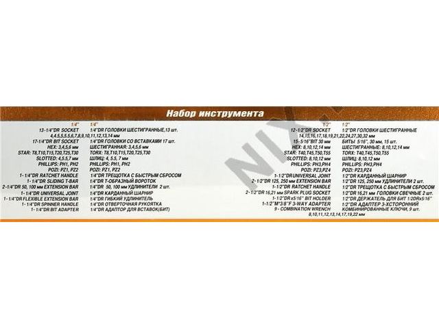 | Тип инструмента в наборе | Удлинитель для торцевых головок (квадрат 1/2 M - F), Удлинитель для торцевых головок (квадрат 1/4 M - F), Гибкий удлинитель для торцевых головок (квадрат 1/4 M - F), Кардан (квадрат 1/2 M - F), Кардан (квадрат 1/4 M - F), Переходник для торцевых головок (квадрат 3/8 F - квадрат 1/2 M), Вороток Т-образный для торцевых головок 1/2 , Вороток Т-образный для торцевых головок 1/4 , Отвертка-вороток для торцевых головок (квадрат 1/4 M), Ключ трещотка для торцевых головок 1/4 , Ключ трещотка для торцевых головок 1/2 , Торцевые головки 1/4 , Торцевые головки 1/2 , Торцевые головки свечные 1/2 , Адаптер для бит (квадрат 1/2 F - шестигранник 5/16 F), Переходник для торцевых головок (шестигранник 1/4 M - квадрат 1/4 M), Вставки (биты) 5/16 , Биты под квадрат 1/4 (биты-насадки), Комбинированный гаечный ключ |