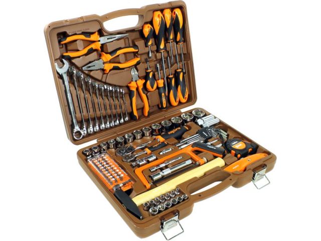 | Набор инструмента в чемодане для автомобиля включает торцевые головки, в том числе свечные головки, под квадрат 1/4 или 1/2 (всего 28 шт.), два ключа-трещотки, удлинители для головок, карданы, отвертку-вороток (держатель для бит и головок отвёрточного типа), а также набор вставок (биты) 1/4 под шлицы TORX, PHILLIPS, POZI, прямые и шестигранные шлицы разных размеров (30 шт.). В набор также входит комплект из 9 шестигранных Г-образных ключей (двусторонние с шаром), комплект комбинированных гаечных ключей (10 шт.), отвертки крестовые и с прямым шлицем разной длины (7 шт.), пассатижи комбинированные, длинногубцы комбинированные, бокорезы, пила по металлу, пятиметровая рулетка, нож выдвижной и молоток |