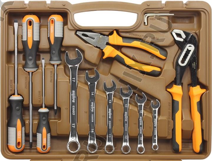 | Набор инструмента в чемодане для автомобиля включает торцевые головки, в том числе свечные, под квадрат 1/4 или 1/2 (16 обычных и 2 свечные), ключ-трещотку 1/2 , удлинители для головок, кардан 1/2 , отвертку-вороток (держатель для бит и головок отвёрточного типа), шарнирный вороток 1/4 , а также набор вставок (биты) 1/4 под шлицы TORX, PHILLIPS, POZI, прямые и шестигранные шлицы разных размеров (30 шт.). В набор также входит комплект комбинированных гаечных ключей (6 шт.), три шестигранных ключа Г-образной формы, отвертки крестовые и с прямым шлицем, пассатижи комбинированные, клещи переставные и молоток |