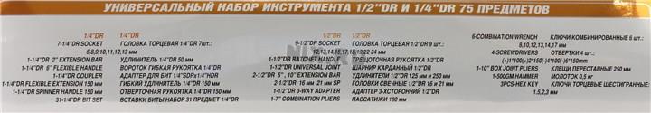 | Тип инструмента в наборе | Удлинитель для торцевых головок (квадрат 1/2 M - F), Удлинитель для торцевых головок (квадрат 1/4 M - F), Гибкий удлинитель для торцевых головок (квадрат 1/4 M - F), Удлинитель для бит магнитный с фиксатором (шестигранник 1/4 M - F), Кардан (квадрат 1/2 M - F), Вороток шарнирный для торцевых головок 1/4 , Вороток Т-образный для торцевых головок 1/2 , Отвертка-вороток для торцевых головок (квадрат 1/4 M), Ключ трещотка для торцевых головок 1/2 , Торцевые головки 1/4 , Торцевые головки 1/2 , Торцевые головки свечные 1/2 , Адаптер для бит (квадрат 1/4 F - шестигранник 1/4 F), Вставки (биты) 1/4 , Комбинированный гаечный ключ, Шестигранный ключ (Г-образный), Отвертка шлицевая (с прямым шлицем SLOT), Отвертка крестообразная (PHILLIPS), Молоток, Пассатижи, Клещи переставные |