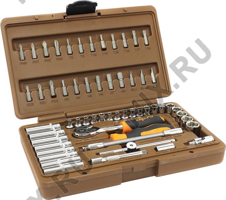 | Набор инструмента в чемодане для автомобиля включает торцевые головки, в том числе глубокие головки, под квадрат 1/4 (18 обычных и 8 глубоких), ключ-трещотку, удлинители для головок, в том числе гибкий удлинитель 1/4 , кардан, Т-образный вороток, отвертку-вороток (держатель для бит и головок отвёрточного типа), а также набор вставок (биты) 1/4 под шлицы TORX, PHILLIPS, POZIDRIV, прямые и шестигранные шлицы разных размеров (24 шт.) |