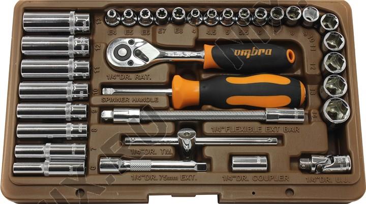 | Тип инструмента в наборе | Удлинитель для торцевых головок (квадрат 1/4 M - F), Гибкий удлинитель для торцевых головок (квадрат 1/4 M - F), Кардан (квадрат 1/4 M - F), Вороток Т-образный для торцевых головок 1/4 , Отвертка-вороток для торцевых головок (квадрат 1/4 M), Ключ трещотка для торцевых головок 1/4 , Торцевые головки 1/4 , Адаптер для бит (квадрат 1/4 F - шестигранник 1/4 F), Вставки (биты) 1/4 |