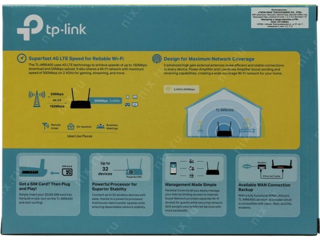 TP-LINK TL-MR6400 Wireless N 4G LTE Router (4UTP 100Mbps, 802.11b/g/n, SIM slot, 300Mbps)