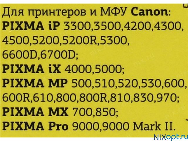 | Совместимость | Canon PIXMA iP3300, iP4200, iP4300, iP5200, iP5200R, iP5300, iP6600D, iP6700D, Pro9000, Pro9000 Mark II, ix4000, ix5000, MP500, MP510, MP530, MP600, MP800, MP810, MP830, MX850 |