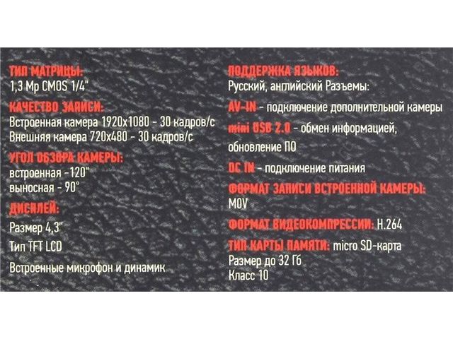 | Прочее | Запись даты/времени на видеоФункция заднего хода - при подключении контактов дополнительного кабеля к фонарям заднего хода, изображение на экране основного устройства при включении задней передачи будет автоматически переключаться на изображение с дополнительной камеры. |