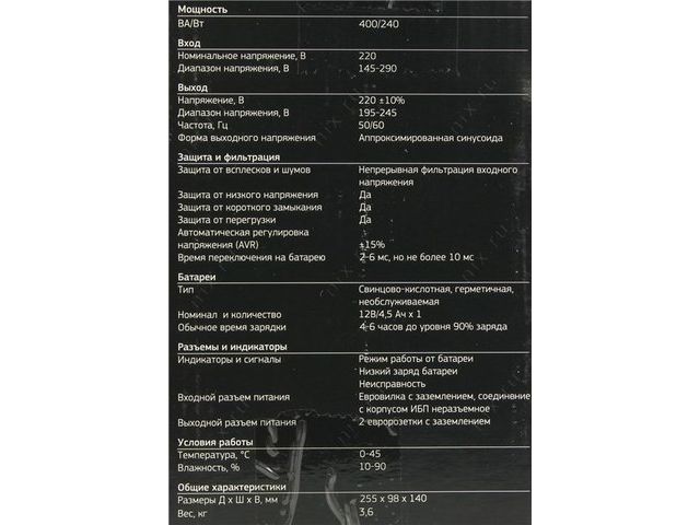 | Максимальная выходная мощность | 400 ВА |