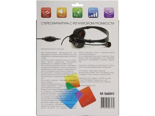 Наушники с микрофоном Dialog M-560HV (шнур 2.2м, с регулятором громкости)