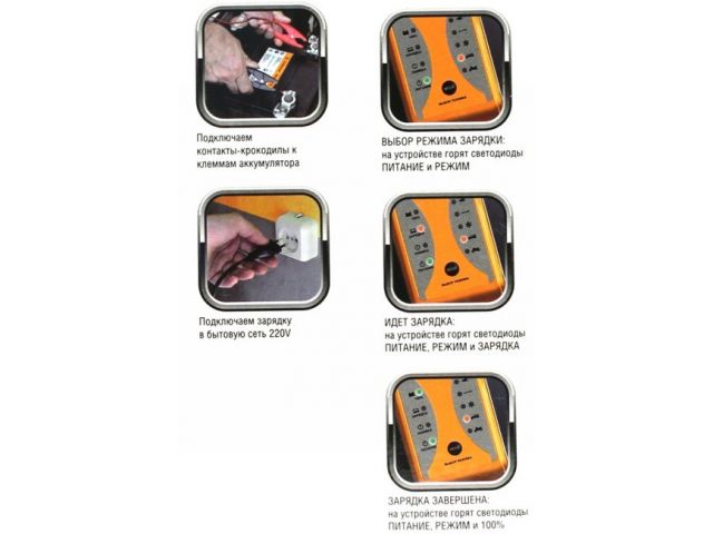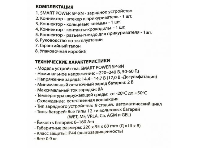 | Режимы | Автоматический заряд АКБ автомобиля (до 160 Ач) или мотоцикла (до 40 Ач) в 9 стадий, Режим Зима для зарядки при низких температурах (также рекомендуется для AGM аккумуляторов), режим «Десульфатация», Режим блока питания |