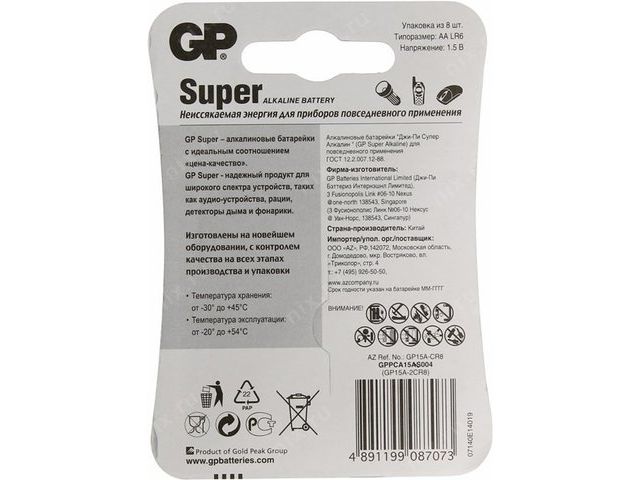 • GP Ultra/Super 15AU-2CR8/15A-8 (LR6) Size AA, щелочной (alkaline) уп. 8шт