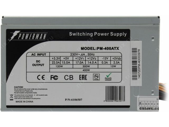 Блок питания Powerman PM-400ATX  400W ATX (24+2x4+6пин) 6106507