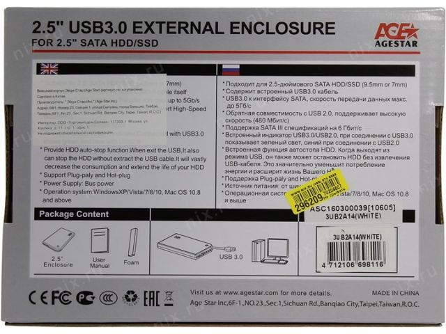 AgeStar 3UB2A14-White (Внешний бокс для 2.5  SATA HDD, USB3.0)