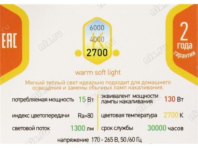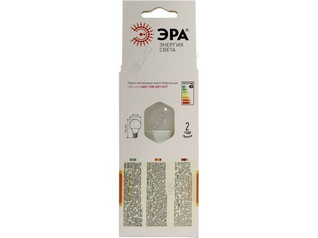 ЭРА (smd) A60-15W-827-E27 (E27, 1300 люмен, 2700К, 15Вт, 170-265В)