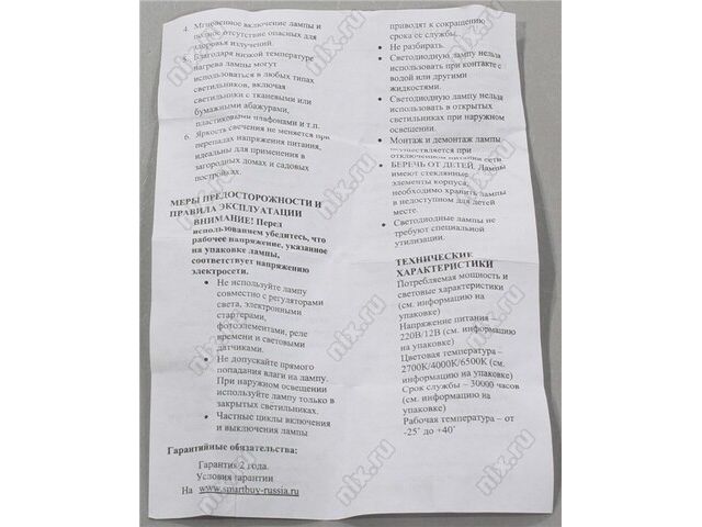| ПРЕДУПРЕЖДЕНИЕ | Некоторые лампы обладают плавающими характеристиками и могут незначительно поменять характеристики с очередной поставкой. Характеристики и фотографии, приведенные нами, имеют справочный характер и могут отличаться при получении. Просьба проверять соответствие товара при выдаче. |