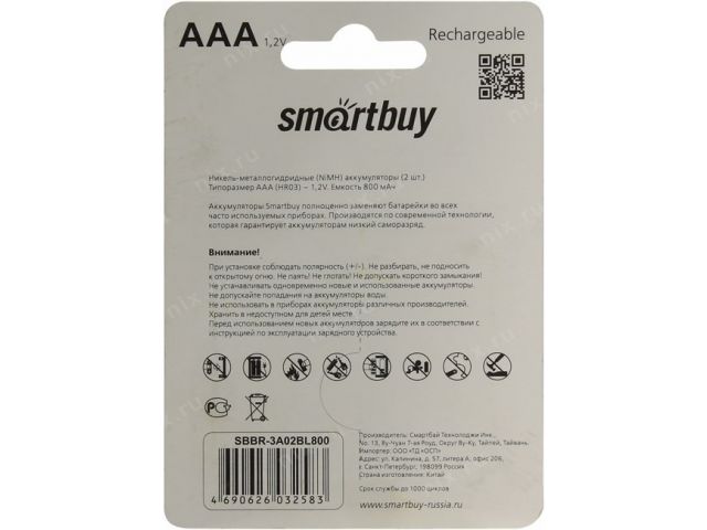 • Аккумулятор Smartbuy SBBR-3A02BL800 (1.2V, 800mAh) NiMh, Size AAA  уп. 2 шт