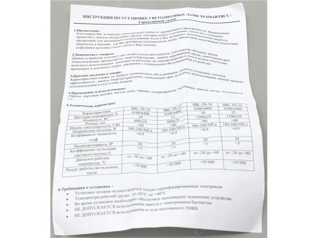 | ПРЕДУПРЕЖДЕНИЕ | Некоторые лампы обладают плавающими характеристиками и могут незначительно поменять характеристики с очередной поставкой. Характеристики и фотографии, приведенные нами, имеют справочный характер и могут отличаться при получении. Просьба проверять соответствие товара при выдаче.Невозможна прямая замена люминесцентной лампы на светодиодную, поскольку в светильниках с люминесцентными лампами установлены электрические схемы, обеспечивающие зажигание этих ламп. Необходимо исключить лишние элементы из конструкции светильника, иначе светодиодная лампа выйдет из строя. Данные операции должен производить квалифицированный специалист. |