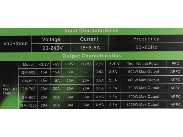 Максимальная нагрузка+3.3V - 18A, +5V - 18A, +12V1 - 20A, +12V2 - 20A, +5VSB - 2.5A, -12V - 0.5A; Комбинированная нагрузка: +3.3V&+5V - 115 Вт