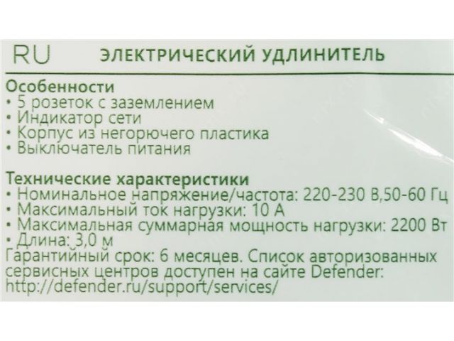 Сетевой удлинитель Defender S530 3м  (5 розеток) 99242