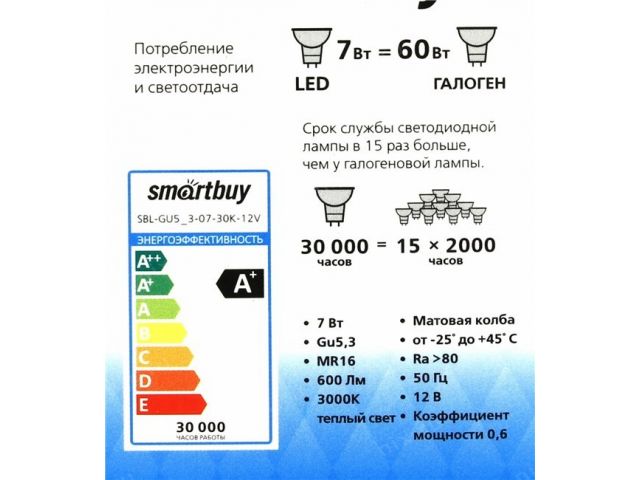 Smartbuy SBL-GU5_3-07-30K-12V  (GU5.3, 3000К, 7Вт, 12В)