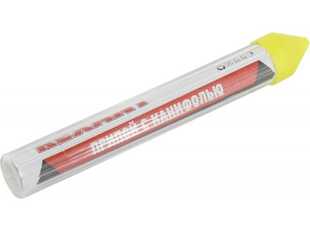 Припой с канифолью - широко применяется в пайке для соединения деталей прочным и надёжным швом. Припой с канифолью Rexant - это проволока толщиной 1 мм, состоящая из сплава олова (60%) и свинца (40%). Содержание флюса канифольного активного MC-20A составляет 2.2%.