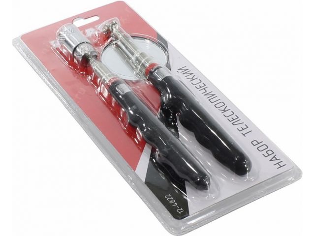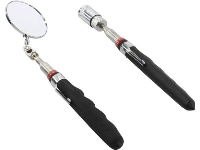 Набор состоит из двух предметов. Зеркало на телескопической рукоятке используется для визуальной диагностики неисправностей, а также мониторинга состояния узлов и агрегатов в труднодоступных и затемнённых местах. Благодаря наличию шарнирного соединения зеркала со штангой, можно тонко регулировать положение зеркала. Магнит на телескопическом стержне с подсветкой предназначен для извлечения из труднодоступных мест элементов крепежа (гайки, болты и прочее) и других предметов массой до 3.6 кг, изготовленных из металлов на основе железа. Питание светодиодной подсветки осуществляется тремя элементами AG13/LR44.