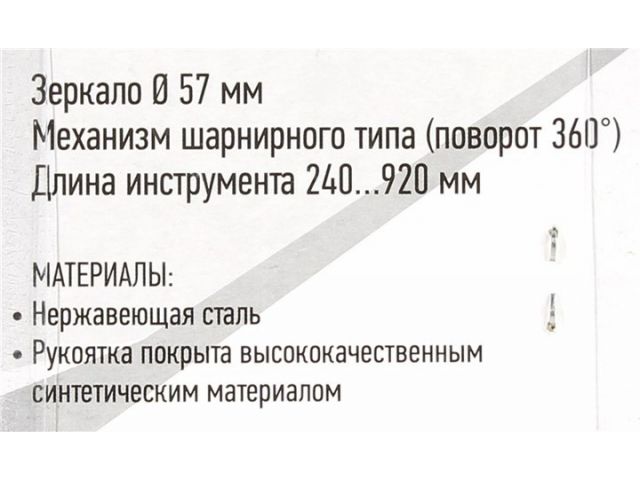 Зеркало на телескопической рукоятке используется для визуальной диагностики неисправностей, а также мониторинга состояния узлов и агрегатов в труднодоступных местах. Механизм шарнирного типа позволяет поворачивать зеркало на 360°, а рукоятка покрыта высококачественным синтетическим материалом.