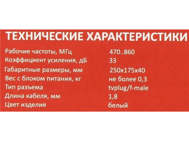 TV - антенна UHF с усилением 33 dBi (каналы 21-69) для крепления на оконное стекло либо обратную сторону ТВ с помощью присосок. Питается от ресивера через антенный разъем