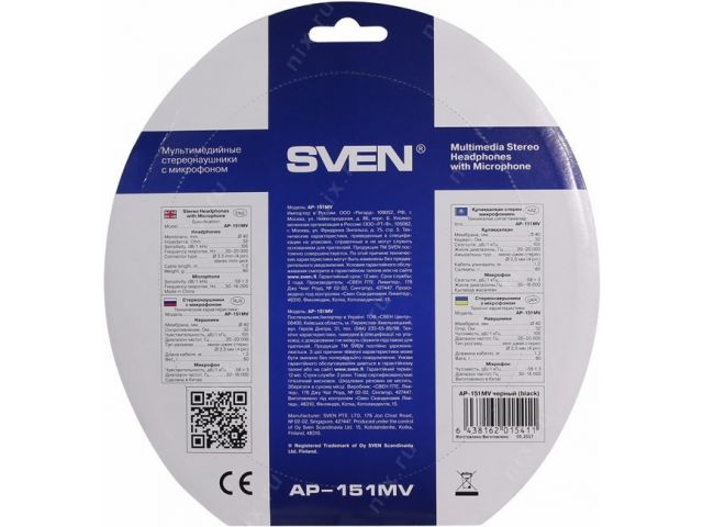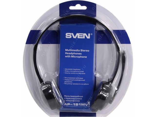 Наушники с микрофоном SVEN AP-151MV Black (с регулятором громкости, шнур 1.2м)
