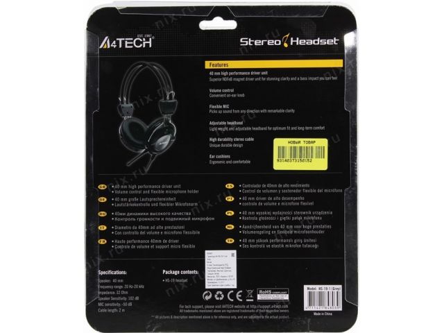 Наушники с микрофоном A4Tech HS-19-1 Grey (шнур 2м, с регулятором громкости)