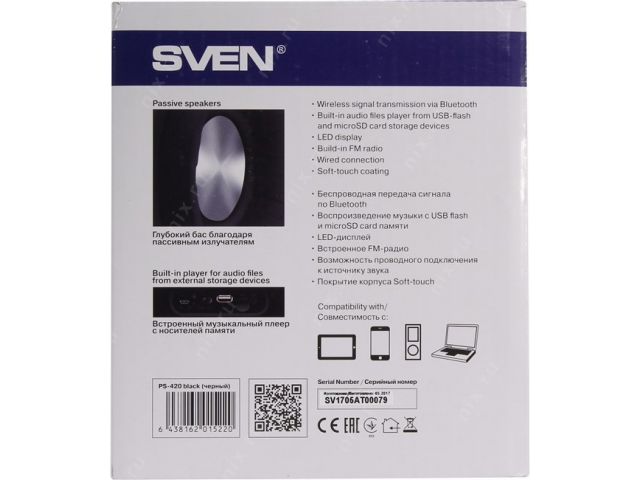Колонка SVEN PS-420 Black (2x6W, Bluetooth, USB, microSD, FM, Li-Ion)