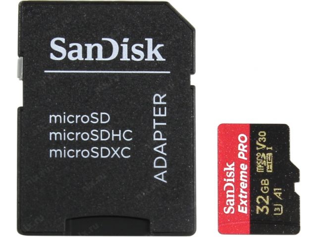Карта памяти SanDisk Extreme Pro SDSQXCG-032G-GN6MA microSDHC V30, UHS-I Class 3 (U3), Class 10 32 ГБ +microSD- SD адаптер