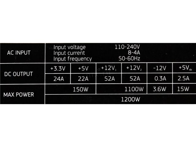 | Максимальная нагрузка | +3.3V - 24A, +5V - 22A, +12V1 - 52A, +12V2 - 52A, +5VSB - 2.5A, -12V - 0.3A; Комбинированная нагрузка: +3.3V & +5V - 150 Вт, +12V1 & +12V2 -1100 Вт |