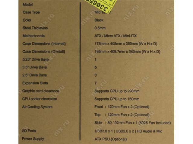 | Предустановленные вентиляторы | 1 вентилятор: 80 x 80 мм (на задней панели) |