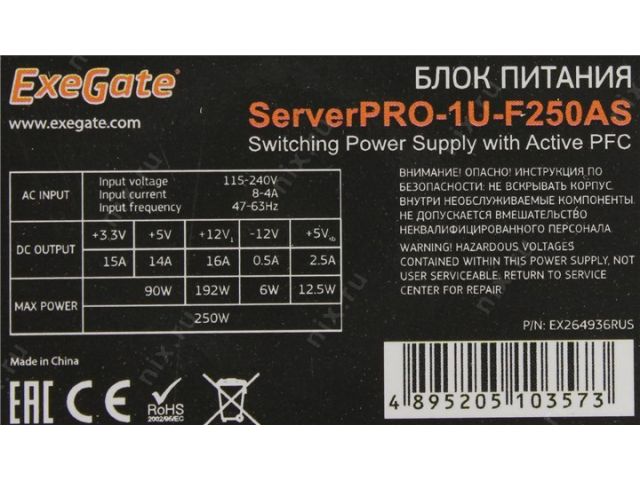 Блок питания ExeGate ServerPRO-1U-F250AS  EX264936RUS  250W (24+4пин)