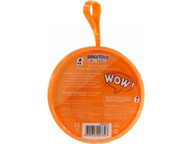 Наушники с микрофоном SmartBuy WOW SBH-840 (шнур 1.2м, с регулятором громкости)