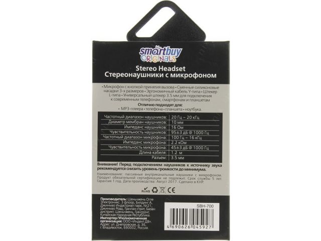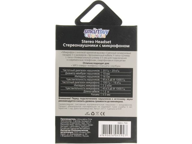 Наушники с микрофоном SmartBuy SBH-700 (шнур 1.2м)